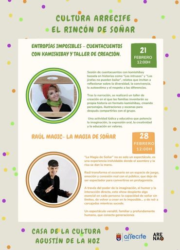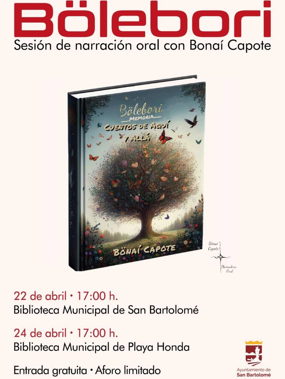 Los próximos días 22 y 24 de abril, en las Bibliotecas Municipales de San Bartolomé y Playa Honda, respectivamente, se llevarán a cabo sendas sesiones de narración oral, para familias y hasta 4 años, con Bönaí Capote.