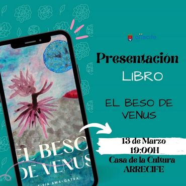 El sábado, 13 de abril, a las 12:00 h, en El Aljibe, Haría, Ana María Angueira, con el seudónimo de Siria Ama-Gatra, nos presenta su tercer libro: El Beso de Venus. Una ficción novelada que nos lleva desde el origen de las Islas Canarias hasta el momento actual. Entre sus páginas se habla del antiguo Egipto, el Maestro Jesús, Miriam de Magdala, César Manrique, Titeroy Gatra y el nacimiento de Lanzarote.